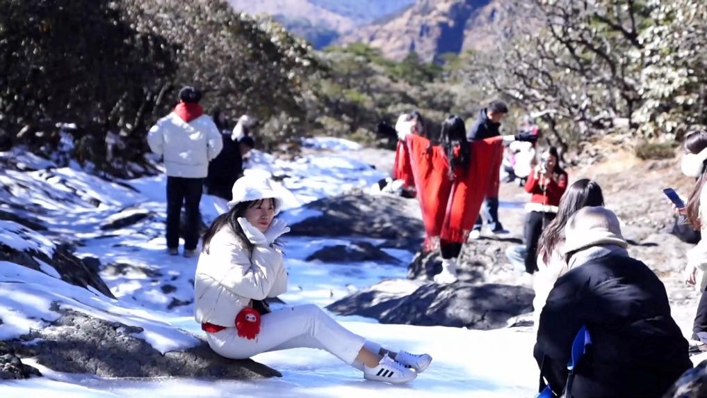 ■位于春城昆明北部的轿子雪山,是中国纬度最低的冬季积雪山峰之一。隆冬时节,这座雪山再度披上银装。鲜见雪景的东南亚游客兴奋地到此体验高山冰雪游,蓝天、冰湖、冰瀑、雾凇成为他们镜头下的“宠儿”。